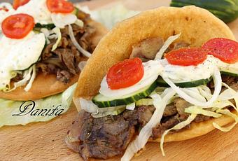 Prendere la pita, mettere sopra la carne, la salsa tzatziki, la cipolla affettata finemente, i cetrioli, qualche foglia di insalata tagliata a julienne e qualche pomodorino e.....mamma mia...chiudere leggermente la pita e dare il morso più grande che potete!!!Ma come si fa a postare un piatto del genere quando si cerca disperatamente di mettersi a dieta!!