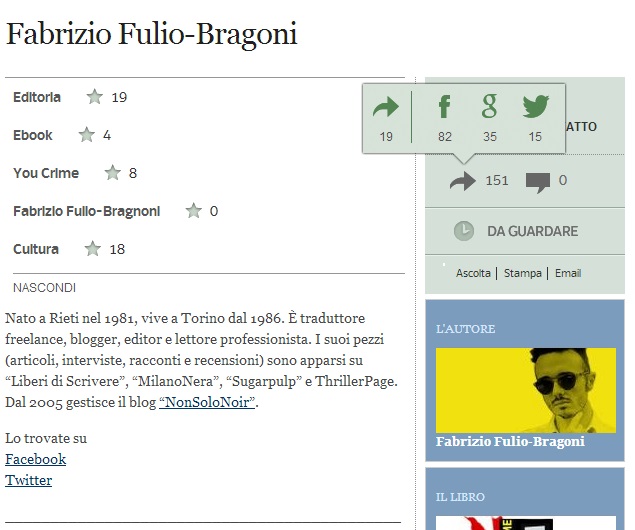 Ma insomma, per farlo ho bisogno di voi: andate sulla mia pagina http://www.corriere.it/cultura/youcrime/2013/fabrizio-fulio-bragoni.shtml e condividete su Facebook e/o Twitter e/o Google+ cliccando sulla freccia poco sopra la mia foto, come nell’immagine sottostante.