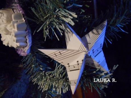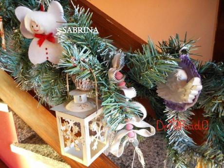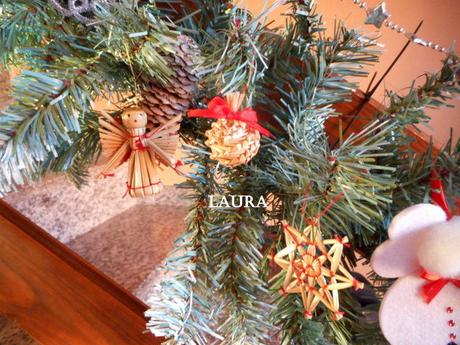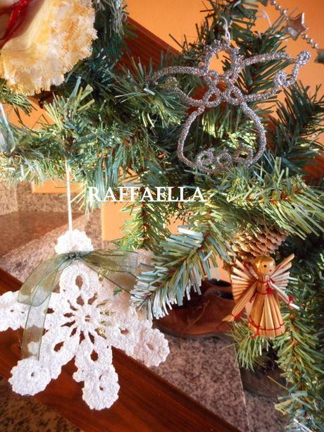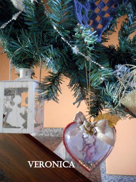 La cosa bella è che le decorazioni natalizie che lo abbelliscono sono frutto di scambi effettuati con le amiche della community di g+ "BarattiAMO... creativamente". Ciascuna ha dato alle altre partecipanti a questa iniziativa delle sommarie indicazioni sull'eventuale tema del proprio albero di Natale e sullo stile e/o il colore predominante. Per le mie decorazioni avevo scelto FIOCCHI DI NEVE e ANGELI, due soggetti che mi sono particolarmente cari; poi ho ampliato il tema aggiungendo anche STELLE e CUORI, altri due dei miei motivi decorativi preferiti. Il caso ha voluto che io abbia ritrovato gli stessi soggetti (più un alce che non c'entra niente... ma che è tanto carino...) anche in 4 piccole lanternine distribuite dal supermercato nel quale vado più spesso.