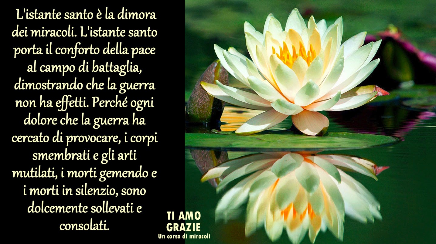 E gli occhi dolenti non accuseranno più, piuttosto brilleranno con gratitudine verso te che li hai benedetti. Il folgore dell'istante santo illuminerà i tuoi occhi e darà la visione, perché possano vedere la faccia di Cristo oltre la sofferenza. La guarigione rimpiazza la sofferenza. Quella cosa che vede uno di loro non può che essere percepita dall'altro, perché entrambi non possono che essere presenti contemporaneamente. E il mondo sarà un testimone di ciò che vedrai e darà testimonianza di esso. Un corso di miracoli.