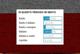 Il piccolo sondaggio senza pretese, lanciato alla vigilia della festa dell'Unità d'Italia, ha dato i risultati che vedete qui a sinistra. 523 sono stati i partecipanti, la maggioranza assoluta dei quali non si sente italiana o solo italiana: 33% solo sardi, 13% sardi e europei, 3% sardi e insieme italiani, 2% sia italiani sia sardi, 1% apolidi. Italiano e basta si sente il 45%. Con qualche dimostrazione di paranoia, come denuncia il fatto che l'11 marzo intorno alle 17.30 qualcuno ha votato in questo senso per 13 volte, intorno alle 19.30 da un ufficio qualcun altro ha espresso la sua italianità senza se e senza ma per 25 volte dallo stesso Ip. E, ancora, il 13 marzo dallo stesso Ip di Cagliari esprimendo la sua italianità uno ha votato per 19 volte (facendo balzare il risultato relativo da 156 a 175): ha cominciato a votare alle 17:38:03 e ha smesso alle 18:11:38. Il giorno dopo, dallo stesso Ip di Milis uno ha votato “italiano” per 7 volte e un altro da Roma per 4 volte.Contenti loro. Sono di una buona scuola: quella che non bada a spese pur di imporre un diffuso sentimento nazionale che sentono altrimenti vacillante.