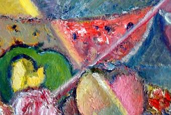Gian Modesto+ Fetta di Anguria-Panettone in chiave geometrica,mela morsicata da Eva,pesca-caco, rose..+oil on paper+