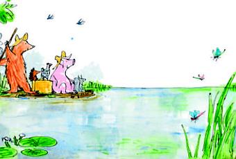 Un maiale, una gallina, uno scoiattolo e un riccio trotterellano in fila indiana con dei bei sorrisi dipinti sui musi. La vegetazione intorno è rigogliosa, la luce dorata e leggera. Sulla riva di un laghetto ad attenderli c’è un amico, un orso. Si intende un orso di quelli compiti e previdenti, con una buona coscienza in fatto di cautele e colpi di sole. Ha portato due cappelli di paglia, uno lo presta generosamente al maiale, e un bel cestino da picnic. I cinque amici animali si salutano e orso, che guida la storia, mostra loro la sorpresa che ha costruito con le sue zampe: una robusta zattera per fare un picnic in mezzo al lago.