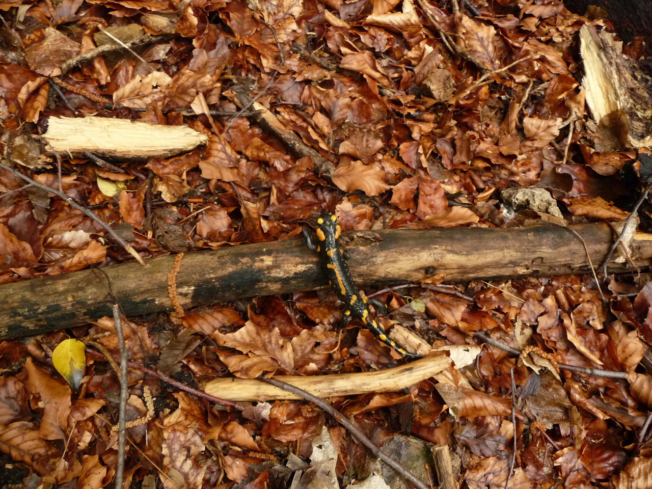 Si tratta della Salamandra pezzata, che qui trova un habitat veramente ideale. Corsi d'acqua poco profondi, terreno con un substrato diversificato, ricchezza di rifugi.Nonchè cibo adatto: piccoli crostacei, larve d'insetti, lombrichi.Anche la buona qualità dell'acqua è essenziale.Abita soprattutto boschi decidui misti: faggeti, castagneti. Proprio come questo.