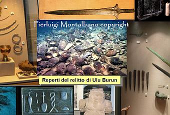 Nel 1982 il pescatore di spugne Mehemet Cakir scopre a Uluburun, a 8,5 km a Sud Est di Kas nel sud della Turchia, il relitto di una nave dell’età del bronzo. L'Istituto di Archeologia della nautica (INA) nella campagna di scavo tra il 1984 e il 1994 ha portato alla luce uno dei più ricchi assemblaggi di oggetti del Bronzo Tardo trovati nel Mediterraneo. Il natante giace su un ripido pendio roccioso a una profondità di circa 50 metri. La datazione dendrocronologia di un piccolo pezzo di legna suggerì il 1350 a.C. per il naufragio della nave, il periodo di Amenophe IV, Akenaton. Il carico della nave è costituito da:. 10 tonnellate di rame in 354 panelle.. 4 tonnellate di lingotti in rame ox-hide. . 1 tonnellata di stagno proveniente da Bretagna e Cornovaglia.. 120 lingotti discoidali a panelle. . 1 tonnellata di resina di terebinto, usata per ottenere profumi, per la fusione a cera persa e per impermeabilizzare le barche, stivata in 150 vasi cananei. . 175 lingotti di vetro blu, di forma discoidale (della costa siro-palestinese). . tronchi di ebano egiziano (Dalbergia melanoxylon). . 3 uova di struzzo (contenitori di liquidi). . alcune zanne di elefante e una dozzina di denti di ippopotamo. . opercula da Murex Seashells (un ingrediente per ottenere l’incenso).. vari gusci di tartarughe carapaces (sound-box per strumenti musicali a corda). . 9 grandi vasi ciprioti finewares, contenenti tracce di melograni e olio d'oliva.. 4 bicchieri artigianali raffiguranti teste di arieti e, in un caso, una donna.. brocche e calderoni in bronzo e rame. . gioielli cananei, inclusi bracciali e collane d'oro.. rottami di oro e argento.. sigilli Siriani, Assiri, Cassiti e Sumeri.. oggetti d'oro egiziano, electrum, argento e pietre preziose.. 1 scarabeo in oro con il cartiglio della regina egizia Nefertiti.. migliaia di perlinedi vetro, agata, corniola, quarzo e ambra del Baltico.. 2 contenitori d’avorio per cosmetici a forma di anatre.. 1 tromba scolpita da un corno d’ariete.. 1 dente di ippopotamo. . utensili in bronzo: trapani, scalpelli, assi e una sega.. frecce, pugnali, spade in bronzo e asce in pietra.. piombo e una linea di aghi per la riparazione di reti.. 1 arpione e un tridente di bronzo indicativi di una pesca dalla nave.. 2 tavole di legno di ebano per scrivere (dittici), ciascuna costituita da una coppia di fogli e una cerniera d'avorio. Sono incassate per contenere delle superfici di cera per gli scritti.. 1 statuetta del Dio Bes in bronzo rivestita in oro (siro-palestinese), forse la divinità che proteggeva la nave. Bes era un Dio benefico dell’Antico Egitto che si diffuse poi nel Mediterraneo. Divinità della gioia, della musica e della danza, allontanava dalla casa i malfattori e i geni malefici, grottesco ma non mostruoso. La maggior parte dei beni personali e degli oggetti di bordo, come strumenti, àncore e lampade a olio, indica che l’equipaggio comprendeva cananei, ciprioti e micenei. I reperti di questi ultimi sono: un paio di sigilli, tre spade, due pettorali con perline di vetro, coltelli curvi, rasoi, scalpelli, sfere in ambra di tipo miceneo, una trentina di pezzi di ceramica fine, una spilla di bronzo e uno scettro cerimoniale con testa in pietra, simile a uno in bronzo trovato in Romania. Questi manufatti suggeriscono i collegamenti tra l’equipaggio e le terre di tutto il Mediterraneo e dell’Europa. Il grande numero di strumenti musicali trovati a bordo indica che, verosimilmente, si svolgevano danze rituali in onore della Dea. Le armi indicano che l’equipaggio era pronto a qualunque tipo di attacco. Probabilmente la nave salpò da Micene dopo aver caricato metalli e altre merci provenienti dall’Occidente mediterraneo. L’ambra trovata nel relitto proveniva dal Baltico, forse attraversò le rotte fluviali dell’Europa centrale. È rilevante l’abbinamento fra percentuali 10:1 di rame-stagno (la proporzione utilizzata per ottenere il bronzo) e la presenza della resina di terebinto, utilizzabile per il metodo della fusione a cera persa.La nave aveva a bordo dei passeggeri importanti, forse ambasciatori dei Popoli del Mare che si recavano in Egitto, alla corte di Amenophe IV e di Nefertiti per rafforzare i legami commerciali. Akenaton, che si chiamava Amenophe IV ed era figlio di Amenophe III, fu il primo eretico della storia. Abolì il culto di tutti gli dei in favore dell'unico dio Aton, rappresentato dal disco solare con i raggi che terminano con delle manine per concedere la vita. Dedicò un tempio ad Aton a Karnak (i sacerdoti di Amon glielo permisero perché pensavano che Aton fosse una forma del dio Amon) ma quando capirono che Aton era un dio diverso, che non era mai rappresentato in forma umana, tramarono contro Akenaton che scappò a Tell-el-Amarna a 260 km a sud del Cairo. L'antica religione fu poi restaurata da Tut ank Aton che divenne Tut ank Amon.