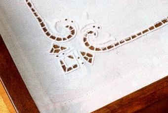 Al termine del ricamo con delle forbicine ben affilate, talgiare il tessuto lungo il contorno del punto pisano sotto le barrette. Tutt'attorno ripiegare i margini del tessuto di 2,5 cm, eseguendo con cura gli angoli e fissare l'orlo con il punto a giorno semplice.
