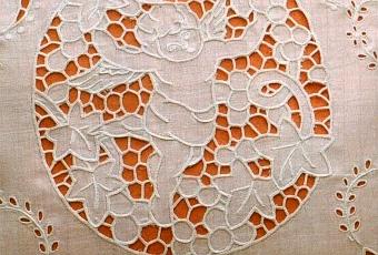 Ricamare con il cotone bianco tutto il motivo traforato a punto festone, le foglioline a punto cordoncino, i rami a punto erba, i poallini a punto pieno e le foglioline a punto inglese.