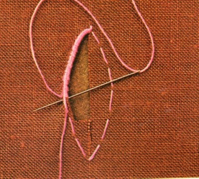 Il punto cordoncino si esegue in due tempi: dapprima passate una filza regolare lungo la linea del disegno poi, tenendo all'interno un filo di imbottitura più o meno grosso a seconda del rilievo che volete dare, eseguite il punto cordoncino: procedete da sinistra verso destra lanciando dei punti verticali molto vicini gli uni agli altri che coprano la filza e trattengano l'imbottitura. Come si esegue il punto pieno: