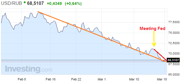 Il rublo è scambiato a 68,51 contro il dollaro, rispetto a 71 di mercoledì scorso. Questo è il più forte apprezzamento