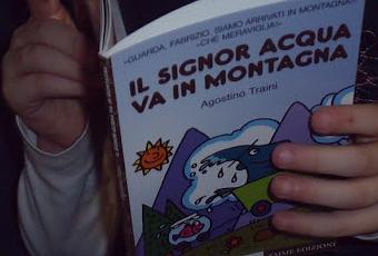 Per questo venerdì del libro proponiamo l'ultimissimo acquisto in fatto di libri che risale ad oggi pomeriggio. Eravamo partiti alla ricerca di Paloma ma in libreria ci hanno detto che il titolo che cercavamo è fuori catalogo così, quando ci ha indicato gli altri libri della stessa collana, ci è arrivato tra le mani un libro che ha come protagonista il Signor Acqua. Noi lo conosciamo bene visto che abbiamo un altro libro che lo vede protagonista di una meravigliosa avventura: Il fantastico viaggio del Signor AcquaDevo ammettere che rispetto all'altro libro, quello preso oggi ci è piaciuto meno ma ci è comunque piaciuto. Il Signor Acqua va in montagna paga il confronto con il precedente libro nel quale Agostino Traini spiega, con semplicità, il ciclo dell'acqua. In quest'ultimo libro la storia è molto più semplice e alla fine lascia come "in sospeso" ma... c'è un ma. Al di là del fatto che come storia ci aspettavamo qualche cosa di più, questo libro introduce un nuovo modo di narrazione che si allontana dalle classiche frasi descrittive. Viene proposto una specie di fumetto con dei personaggi illustrati di lato e con accanto frasi che rappresentano un vero e proprio messaggio diretto. Di lato viene illustrato il personaggio che parla e vi si abbina la frase diretta che dà vita ad una storia grazie ad una serie di discorsi diretti.Un diverso modo di leggere una storia.E poi chi incontra il Signor Acqua in montagna? Nientemeno che la Mucca Moka, altro personaggio molto amato in casa nostra!