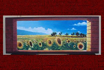 La sua idea era di realizzare un campo di girasoli: iniziò dal cielo e ottenne una bella sfumatura. Anche le nuvole vennero belle, sfruttando le naturali imprecisioni delle setole del pennello. Poi decise di spostarsi nel campo sottostante, dipingendo una base verde-terrosa dove, nella sua mente, avrebbe "tirato fuori" i girasoli, per creare maggiore profondità.