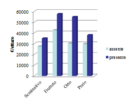 In un’analisi svolta con l’Università di Trieste si è stimato il valore dell’irrigazione in rappresentative realtà agricole nazionali a partire dall’effetto prodotto sul valore dei suoli agrari (metodo edonimetrico). La valutazione ha coinvolto tutte le regioni (una provincia rappresentativa per regione) per un totale di 166 regioni agrarie e 1368 comuni e i seguenti dati: • valore Agricolo Medio (VAM) (Fonte: Agenzia delle Entrate, 2013); • struttura delle attività agricole (VI Censimento Agricoltura, 2010); • tipo e fonte di irrigazione (VI Censimento Agricoltura, 2010); • caratterizzazione geografica e climatica (ISTAT; Banca Dati Agrometeorologica del CRA-CMA); • caratterizzazione economica generale (VI Censimento Agricoltura 2010, Censimento Industria, Commercio e Artigianato, 2011); • caratterizzazione demografica (Censimento Popolazione 2011). • il VAM (Valore Agricolo Medio) delle colture più importanti dal punto di vista economico (seminativo, frutteto, orto e prato) si aggira sui 40 mila €/ha. • differenza fra irriguo e non irriguo pari a 13,5 mila €/ha. In termini percentuali tale differenza è più elevata al Centro-Sud (60-80%).