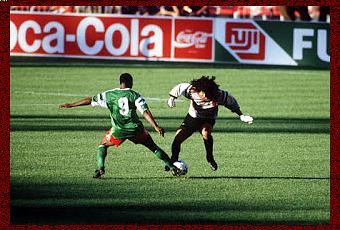 La palla è rubata, la porta è vuota, Higuita prova da dietro ad abbattere Milla ma non può raggiungerlo.