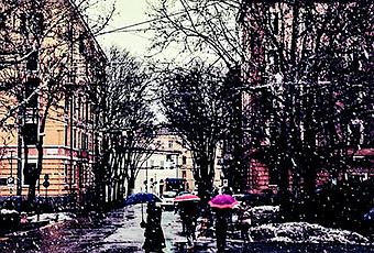 The wait, the snow, the journey, the black, the strips and the umbrellas.
