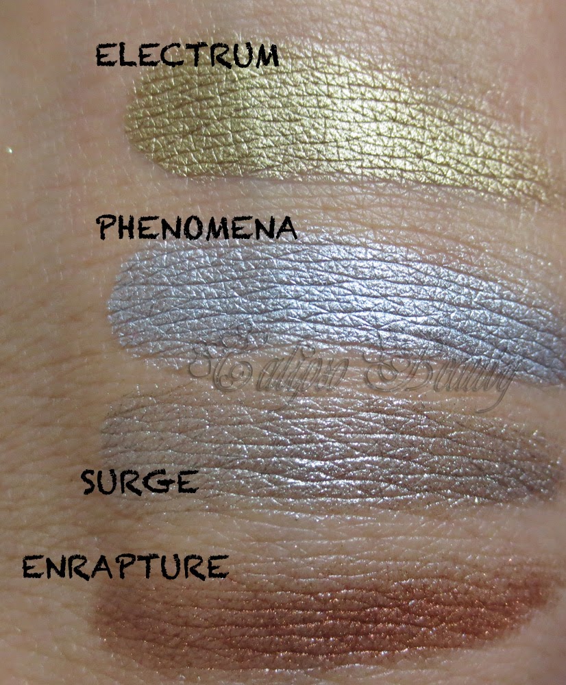 PigmentazioneSono tutti intensi infatti gli swatches rappresentano quello che si ottiene con una sola passata di prodotto. Enrapture è quello che spicca meno tra le 4 tonalità, il più deciso è Phenomena.