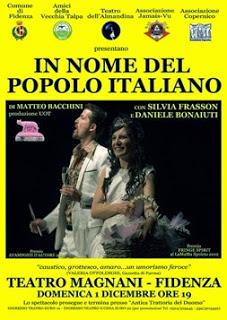 domenica 1 dicembre al Teatro Magnani di Fidenza "In nome del Popolo Italiano" di Matteo Bacchini con Daniele Bonaiuti e Silvia Frasson. E' la deposizione strampalata di un romanesco manesco che illustra a un maresciallo dei carabinieri come si trasforma un matrimonio in un funerale, con annessa testimonianza della sposa in quanto persona disinformata dei fatti (e di tutto il resto). Ma il fattaccio di cronaca nera resta in secondo piano - soprattutto nella coscienza dei protagonisti - e i riflettori sono puntati sulla “filosofia de vita” di due fratelli sballottati in un mondo diventato troppo complicato da capire. Un’armata brancaleone ridotta ai minimi termini che combatte la sua battaglia quotidiana contro l’italiano (la lingua) e lo straniero (gli albanesi i barboni i milanesi i napoletani i negri e il pandoro di Verona, in ordine di apparizione). I Mostri cinquant’anni dopo, anche se non siamo più negli anni ‘60 e sul palco - come nel resto d’Italia - c’è poco da ridere. Un secolo e mezzo dopo Garibaldi, il ritratto del belpaese è un frullato di ignoranza, un cocktail di luoghi comuni, una miscela pericolosa di consumismo e miseria. Aggiungere un bel po’ di TV e un pizzico di scuola dell’obbligo, agitare bene e servire prima che evapori senza lasciare traccia. O che vi esploda in faccia. http://feeds.feedburner.com/BlogFidentino-CronacheMarziane