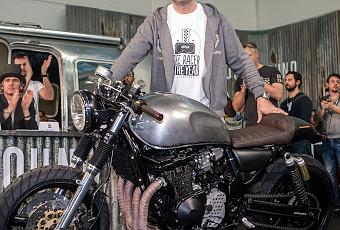 GSX 750 Inazuma "Flying Pelander" built by Fabrizio Giulini of Motoratelier for Fabio Cormio of Cafe Racer mag Shot at motor Bike Expo in Verona