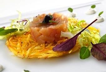 Mettere Il filetto di salmerino in un contenitore con sale, zucchero, aneto e le bacche di pepe nero e lasciar marinare 7-8 ore. Rimuovere e risciacquare bene con acqua fredda; mettere il tutto in un canovaccio e lasciare riposare per una notte. Tagliare a dadini e condire con un filo d’olio. Tagliare le patate a julienne e salare. Dorare le patate su entrambi i lati in una padella antiaderente con 20 cm di diametro. Montare la panna acida aggiungendo un pizzico di sale e l’erba cipollina tritata. Servire nei piatti nel seguente modo: adagiare il rosti di patate al centro del piatto e sistemare al centro la tartare di salmerino aiutandosi con uno stampino. Guarnire con l’insalata a piacere .