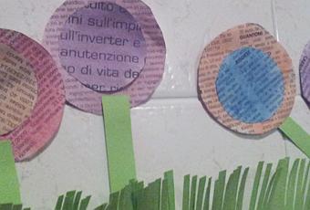 E’ bastato qualche foglio di giornale, grigio e imbruttito dalle tante notizie negative, che i bimbi hanno colorato con gli acquarelli utilizzando colori brillanti; li abbiamo poi tagliati in forma circolare prendendo come sagome dei bicchieri. Inserendo un cerchio piccolo dentro uno di circonferenza più grande e… il risultato sono dei grandi fiori da poter mettere ai piedi del grande albero nell’attesa che i rami stessi si possano coprire di verdi foglie ma per questo c’è ancora tempo e presto vi sveleremo come li stiamo creando.