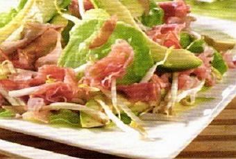 Un'insalata gustosa con prosciutto cotto, germogli di soia e avocado che fornisce all'organismo circa 297 kcal e si prepara in 20 minuti.