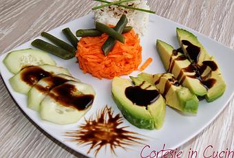 In quest'insalata troviamo il cetriolo ( indicato per depurarsi essendo composto per il 97% d'acqua), le carote (piena di vitamina A, B1, B2, C) e l'avocavo; l'avocado è un alimento ricco di grassi buoni per il cuore poichè aumenta il colesterolo buono nel sangue ed i grassi sono insaturi, ma siccome è abbastanza calorico bisogna stare attenti a non abbondarne (250 calorie l'etto).