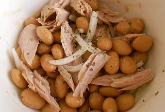 Sbriciolate il tonno a pezzi piuttosto grossi, tagliate a fettine sottili le cipolle e sistemateli sui fagioli nel piatto da portata.