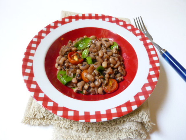 Ingredienti:- 1 aringa affumicata- 200 gr. di fagioli dell’occhio- una decina di pomodorini - insalatina fresca e tenera- pepe nero macinato fresco- 1 tazzina da caffè di succo di pomodoro- mezza tazzina da caffè di olio evoProcedimento:Per prima cosa sciacquiamo sott’acqua corrente l’aringa, la asciughiamo tamponandola con carta cucina, tagliamo la testa, togliamo la pelle, la apriamo e ricaviamo i filetti. Li mettiamo a mollo nel latte per almeno una notte. Mettiamo a lessare in fagioli.Nel frattempo facciamo appassire i pomodorini nel forno: li tagliamo a metà, facciamo un giro d’olio e inforniamo a 100 gradi per un’ora e mezza.Prepariamo un’emulsione con una tazzina di succo di pomodoro (quello da bere per intenderci), mezza tazzina di olio evo, il pepe e un pizzico di origano.Togliamo i filetti di aringa dal latte, sciacquiamo velocemente, asciughiamo bene e tagliamo a piccoli pezzettini.In un’insalatiera mettiamo i fagioli, l’aringa, i pomodori, l’insalatina e condiamo con l’emulsione.Mescoliamo bene e serviamo tiepida.Nota: essendo l’aringa salata, non aggiungiamo sale.