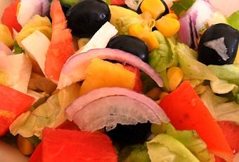 3) A questo punto, versate le olive nere e il mais in una insalatiera, aggiungeteci il cocomero, l’ananas a dadini, il pomodoro lavato e tagliato a rondelline, la cipolla rossa a fette sottilissime, il formaggio primo sale tagliato a dadini (o il tofu) e condite tutto con olio, sale e aceto balsamico (on in alternativa con il succo di mezzo limone), mescolate e servite!