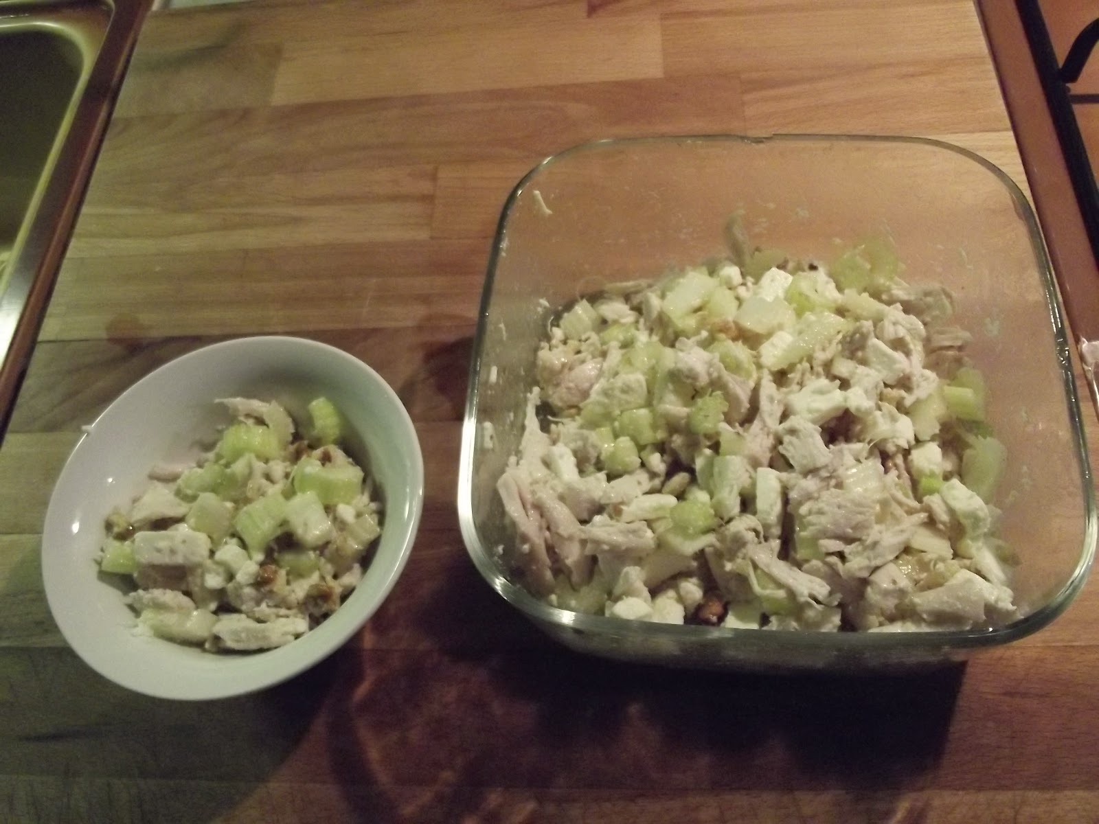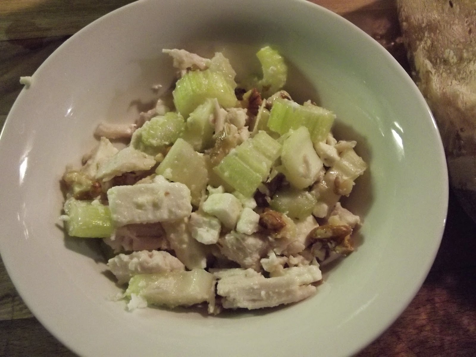 Bollite il petto di pollo intero in una pentola a pressione chiusa in abbondante acqua salata per circa 10 minuti.Una volta intiepidito, tagliatelo a striscioline o pezzetti, unite le noci schiacciate e sbriciolate, il sedano lavato e tagliato a cubetti, la fontina o la feta tagliata anche a cubetti e condite con olio evo q.b. e aceto di mele a fermentazione biologica e se serve, aggiungete un pizzico di sale.