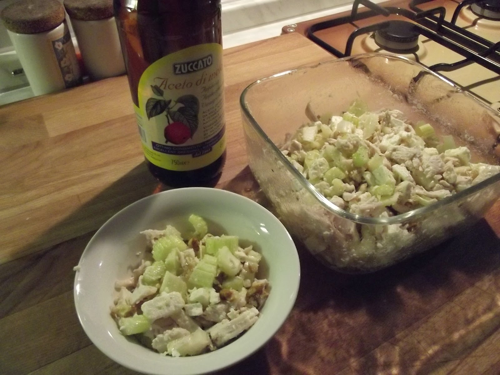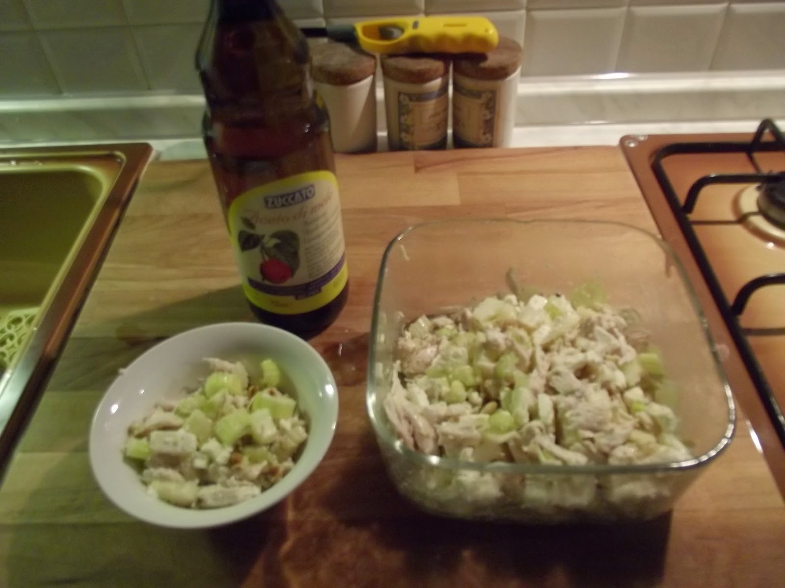 Oggi vediamo come preparare una sfiziosa insalata di pollo con aceto di mele a fermentazione biologica . La primavera invoglia a trovare e provare nuove ricette fresche ed invitanti, ma anche leggere. Io sono un'amante dell'insalata di pollo che fa mia mamma, ce ne sono tante varianti, si puo' utilizzare la fontina o il grana, o la feta, si possono utilizzare le noci o i pinoli, si puo' fare con la gelatina, il prosciutto, i carciofini, le olive, gli champignon, ma la migliore in assoluto e' questa, mi piace perche' posso mettere tanto formaggio e io sono formaggio dipendente , cosi' con l'occasione della collaborazione con Zuccato , ho provato a modificare un po' la ricetta e ad usare l'aceto di mele a fermentazione biologica al posto del limone con cui l'ho sempre condita. Eccola: