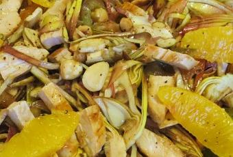Un insalata semplice, ideale per riprendersi dai presunti eccessi di Capodanno. Petto di pollo spadellato, ridotto a pezzetti e servito con un insalata cruda di carciofi e frutta secca tostata, il tutto condito con una vinagrette all’arancia.