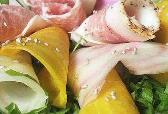 1 rapa gialla 1 rapa di Chioggia cicoria da taglio 12 sottili fette di lardo olio extravergine di oliva italiano semi di chia sale