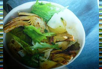 in un piatto di portata disponete le patate aggiungete i carciofi l'insalata e le scaglie di formaggio mescolate il tutto