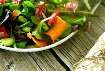 Mondate l'insalata, distribuitevi le carote tagliate a nastro con il pelapatate, gli asparagi lessati e tagliati a metà per il lungo, le fave, il salame di Varzi DOP tagliato a dadolata e terminate condendo con una citronette, una emulsione di olio e limone. A mio gusto non occorre salare, vista la presenza del Salame di Varzi, che, pur essendo dolce, ha comunque una buona sapidità.