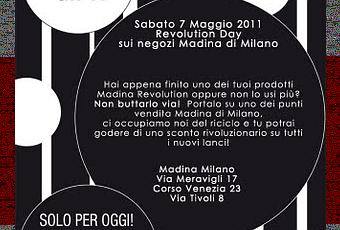 Sabato 7 Maggio 2011Revolution Daysui negozi Madina Milano.''Hai appena finito uno dei tuoi prodotti Madina Revolutionoppure non lo usi più?Non buttarlo via! Portalo su unodei punti vendita Madina Milano,loro si occuperanno del riciclo stessopotendo cosi godere di uno sconto rivoluzionariosu tutti i nuovi lanci!PUNTI VENDITA:Madina Milano-Via meravigli 17;-Corso Venezia 23;-Via Tivoli 8.Questa iniziativa è una meraviglia!!!!La trovo estremamente utile!!Peccato però che nella mia città non c'è!!Spero aprano al più presto!!!Per tutte/i quelle/i che desiderano Madina nella provinciadi Roma alzino la mano ;PBacio!