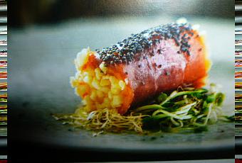spolverizzate le estremità con granella di mandorle servite su un ciuffetto di germogli irrorate con olio aromatico e semi di papavero