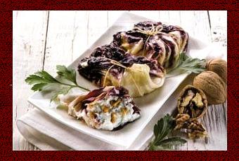 scaldiamo un litro di acqua con aceto e tuffiamo le foglie di radicchio per 1 ' farciamo con il riso arrotoliamole facendo degli involtini