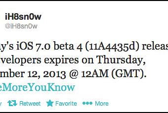 Come ogni beta di mamma Apple anche la beta 4 ha una scadenza. Queste scadenze costringono chi ha installata una versione beta del firmware di eseguire l’aggiornamento alla prossima versione beta o alla versione disponibile in quel momento entro una determinata data. iH8sn0w noto personaggio nel mondo del Jailbreak, ha recentemente twittato che iOS 7 beta 4 con build 11A4435d scadrà Giovedi 12 Settembre 2013 alle 00:00 GMT.