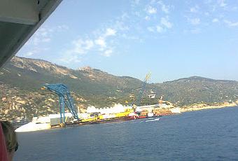 Mentre si celebra il processo di I grado del disastro della nave Concordia della Costa Crociere, mi è capitato di andare all'Isola del Giglio.Odio il turismo di morte e condivido il giudizio che giornalisti intelligenti ne hanno dato: imbecilli che vanno a fotografare la nave naufragata facendosi immortalare con sullo sfondo la sua tragica e triste sagoma.Impossibile non vederla quando si arriva a Giglio Porto: intorno ad essa è sorto un funereo ma necessario cantiere.Pudicamente e per rispetto ai due cadaveri che ancora racchiude, non volevo fotografarla, come già facevano in molti dal traghetto che da Porto S. Stefano ci conduceva all'Isola.Poi ho pensato che avrei scritto qualche considerazione su di essa ed allora ho preferito mostrarla ora, come la vedevo.