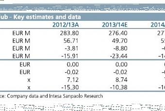 Rispetto al precedente documento dell'ottobre 2013, le stime di Banca IMI sono peggiorative, sia in termini di EBITDA, sia per quanto riguarda il risultato netto di esercizio: anche ad ottobre l'utile era previsto manifestarsi solo nella stagione 2015/16, ma sarebbe stato un confortevole +7,3 mln contro la previsione di 0,7 mln attuale.