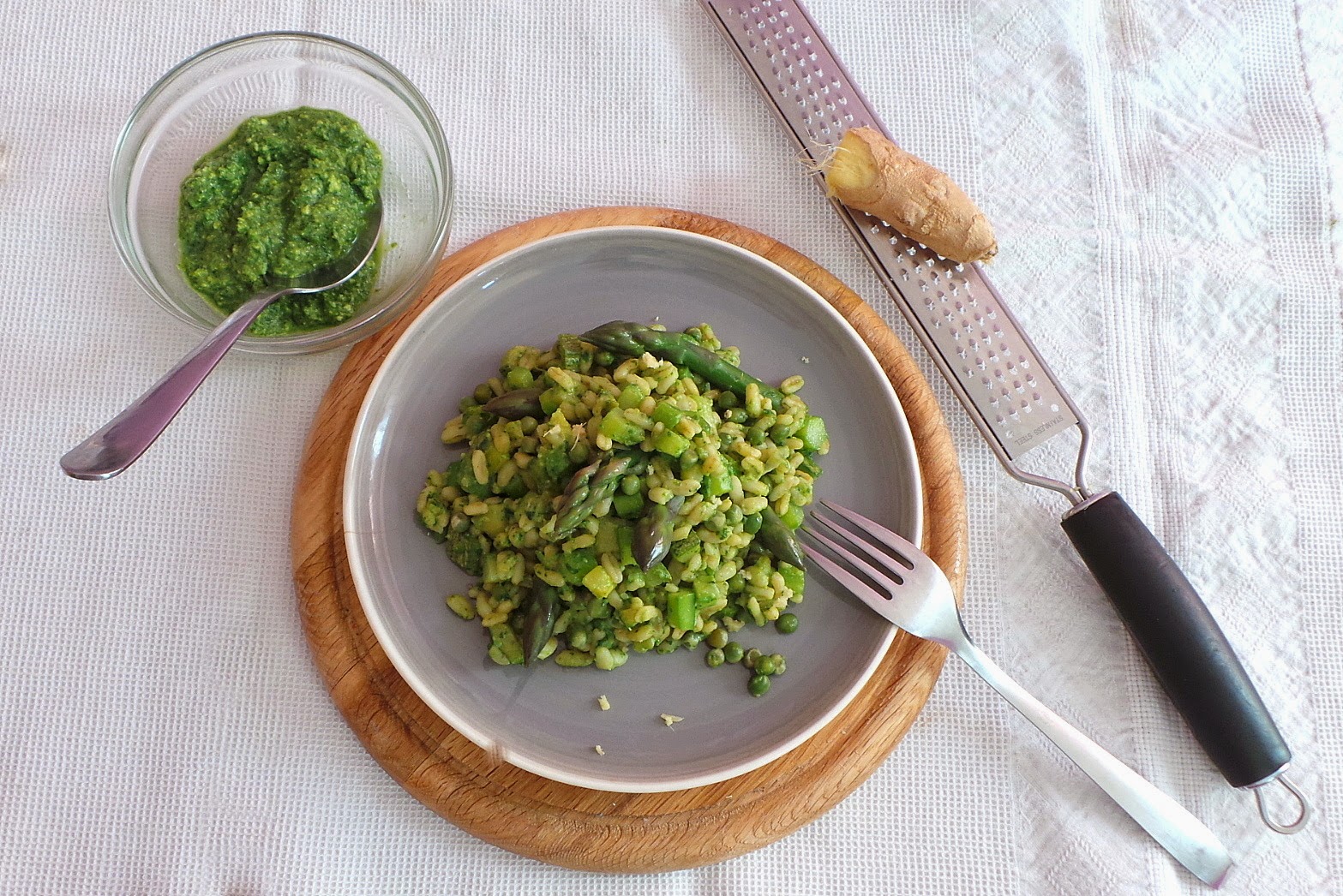 Ingredienti per 2 persone 140g di kamut precotto2 zucchine piccole 50g di piselli precotti o surgelati 10 asparagi 2 cucchiai di olio extra vergine d’oliva 1 scalogno 100gr di ricotta 100g di spinacini freschi Sale qb Gambo di zenzero da grattugiare In una pentola mettete l’acqua salata a bollire, sbollentate gli asparagi. In una padella mettete l’olio, con lo scalogno a pezzetti e fate rosolare. Aggiungete le zucchine a cubetti, poi i piselli e fate rosolare aggiungendo un paio di mestoli di acqua di cottura. Nel frattempo cuocete il kamut, scolate lasciandolo abbastanza acquoso e mettetelo nella padella con le verdure. Aggiungete anche i gambi degli asparagi fatti a fettine. Tenete da parte le punte per completare alla fine il piatto. Fate ora amalgamare il tutto. Mettete gli spinacini in un mixer e frullateli, aggiungete la ricotta un pizzico di sale per creare una crema. Aggiungete la crema al kamut e mescolate, raggiungendo così la cremosità desiderata.