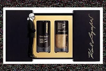 La collezione, abbastanza essenziale a dir la verità, si compone di due smalti, uno nero e uno oro, una palette di ombretti la cui maggiore particolarità sta nella forma, che riprende il profilo dello stilista, due pochettine a stampa e la bambolina di Kaiser Karl...