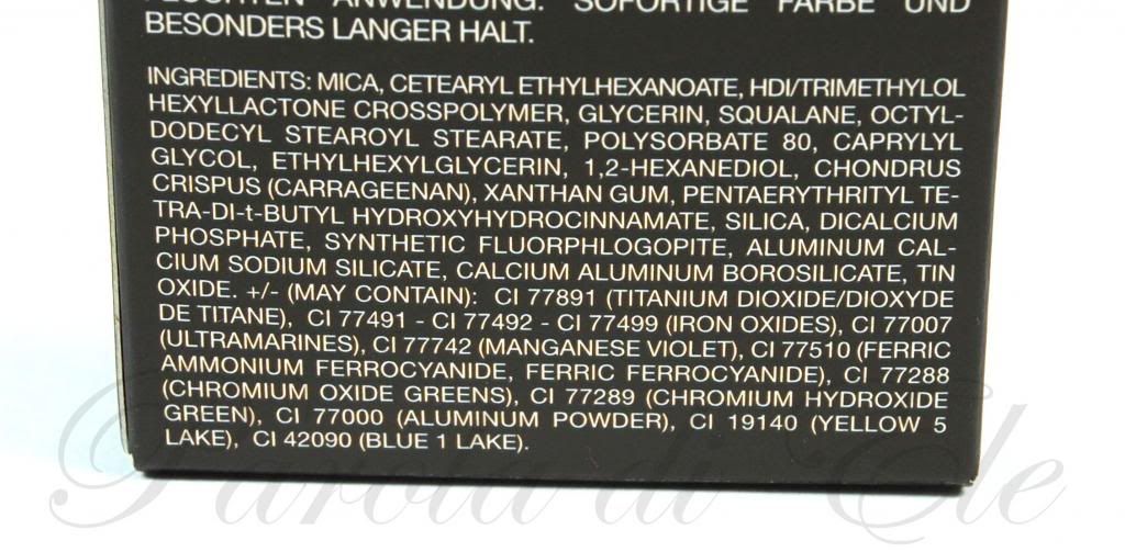 Come ormai saprete, non bado ad inci per gli ombretti, ma ve lo lascio in caso vogliate sbirciarlo. Non contiene parabeni.