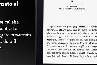Il lettore di eBook più avanzato al mondo, risoluzione più alta, schermo touch ad alto contrasto, luce integrata e batteria che dura fino a 8 settimane