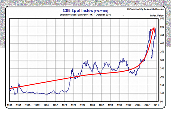Crb è un'indice che rappresenta il prezzo delle commodities fisiche. Come potete notare mentra la tipografia Fed stampa, il prezzo di questo indice ovviamente sale. Morale, invece di risolvere il prolema, la stampa di moneta,lo trasla e a mio avviso lo ingigantisce