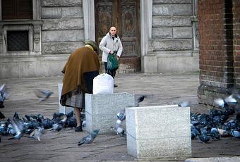 Foto di Andrea Ventura - "Piccionara" nutre i suoi amati piccioni, un passante si ferma a guardare