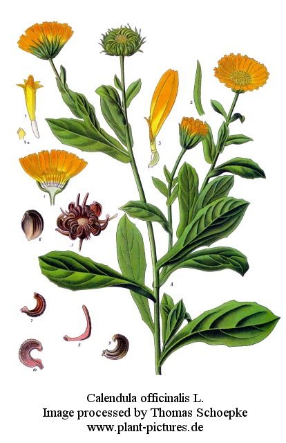 Le Asteracee sono una famiglia di piante dicotiledoni (piante a fiore nel cui seme l’embrione è dotato di due cotiledoni), per la maggior parte erbacee. La peculiarità di questa famiglia è l’infiorescenza a capolino composta da un insieme di piccoli fiori compatti tra loro. Delle Astereaceae fanno parte, oltre alla Calendula officinalis, la Matricaria recutita, il Taraxacum officinalis, l’Artemisia vulgaris e molte altre. La Calendula, può raggiungere fino a 70 cm di altezza. Presenta la radice fittonante, il fusto ramificato e ricoperto da peluria e foglie lanceolate a margine intero o leggermente dentato. Se strofinata, la pianta, emana un gradevole profumo, non forte, ma caratteristico. I fiori sono commestibili, dal gusto amarognolo e leggermente salato.Le sue foglie possono essere raccolte da marzo a novembre, cogliendole una per una. I fiori, invece, si raccolgono da aprile a giugno quando non sono completamente aperti per evitare che sfioriscano.