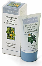 - Il secondo prodotto che ho testato è il Latte di pulizia per il viso al Cetriolo e all’Amamelide, specificatamente dermopurificante per pelle mista e grassa. Un latte detergente dolcissimo e cremoso, che rispetta il ph della pelle e la pulisce richiudendo i pori dilatati, dalla consistenza lattiginosa perfetta. E’ arricchito con Acqua distillata di Amamelide, conosciuta per le sue proprietà astringenti, ed estratto di Cetriolo, con caratteristiche rinfrescanti.