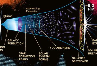 Un altro risultato interessante riguarda il destino ultimo dell’Universo. Dalla scoperta dell’espansione accelerata, i cosmologi hanno ipotizzato un certo numero di scenari per tentare di descrivere l’evoluzione futura dell’espansione cosmica. Uno di questi, chiamato “Big Freeze” (il grande gelo), predice che dopo circa 100 mila miliardi di anni l’Universo sarà diventato talmente grande che i rifornimenti di gas necessari per formare le stelle si saranno esauriti da molto tempo. Le stelle si spegneranno gradualmente, lasciandosi dietro solo buchi neri che, a loro volta, evaporeranno lentamente man mano che lo spazio diventerà sempre più freddo. Ma uno scenario ancora più drammatico è detto “Big Rip” (il grande strappo). Esso si basa sugli effetti dovuti all’energia oscura che diventa sempre più importante nel corso del tempo. In questo caso, il tasso di espansione dell’Universo diventerà così elevato che dopo poco più di 20 miliardi di anni tutta la materia inizierà a disgregarsi e, a loro volta, anche gli atomi si separeranno nei loro costituenti fondamentali lasciandosi dietro solo particelle elementari e radiazione.