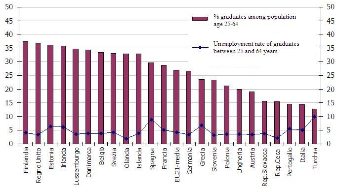I primi della classe, invece, sono danesi (30,9%) e olandesi (32,7%) per i maschi, ed estoni (38,8%) e finlandesi 39,4%) per le donne. In Germania i maschi laureati sono il 27,1% e le donne il 20,3%, in Francia rispettivamente il 23,7% e il 26,0%, in Gran Bretagna il 29,9% e il 29,7% e in Spagna il 28,1% e il 28,3%